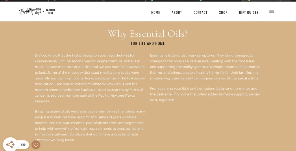 She stated “I want to help mamas like me, and others, create a healthy home life for their families in a modern way using ancient techniques, one small change at a time.” Im a firm believer in essential oils not because they make me feel more at ease with myself, but they always make me feel balanced and happy. It’s nice to see others talking about their experiences and what they can contribute to society with just a simple meaningful explanation. I love how she goes into debt about the different types of oils, and what they can be used for, and how they benefit your overall mental/physical health. It takes strong women to come forth with personal stories and experiences and share them with the internet, but this blog has made me want to help people in every way just like she did. Tabithas blog has a lineup of kid friendly, and detailed oils and what they can contribute, she evens give a discount code which is wonderful!